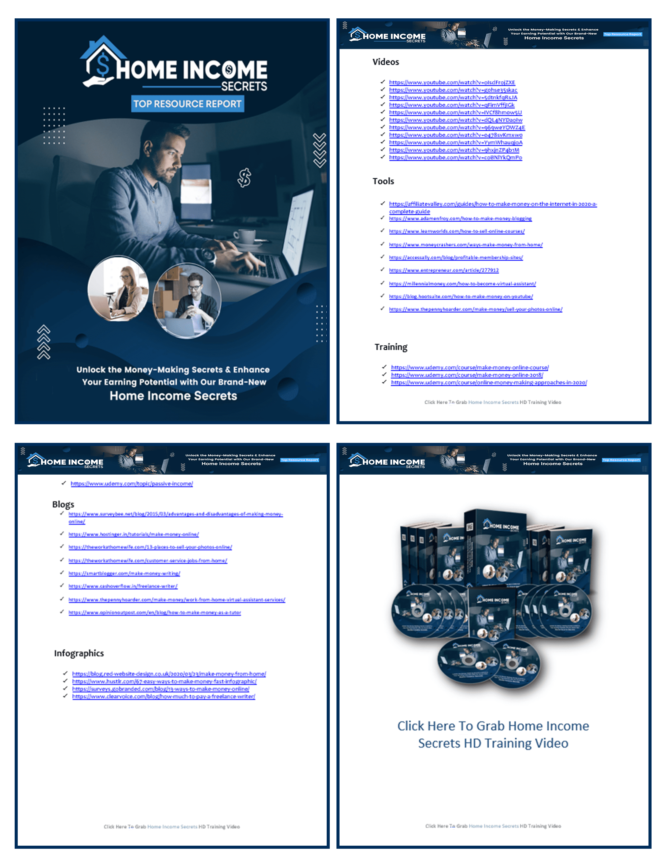 This is a comprehensive Research Report on Home Income Secrets (reels, shorts, stories, and more) practices and includes references to Videos, Tools, Training courses, Forums, Affiliate programs, Infographics, Facts, and Case studies.