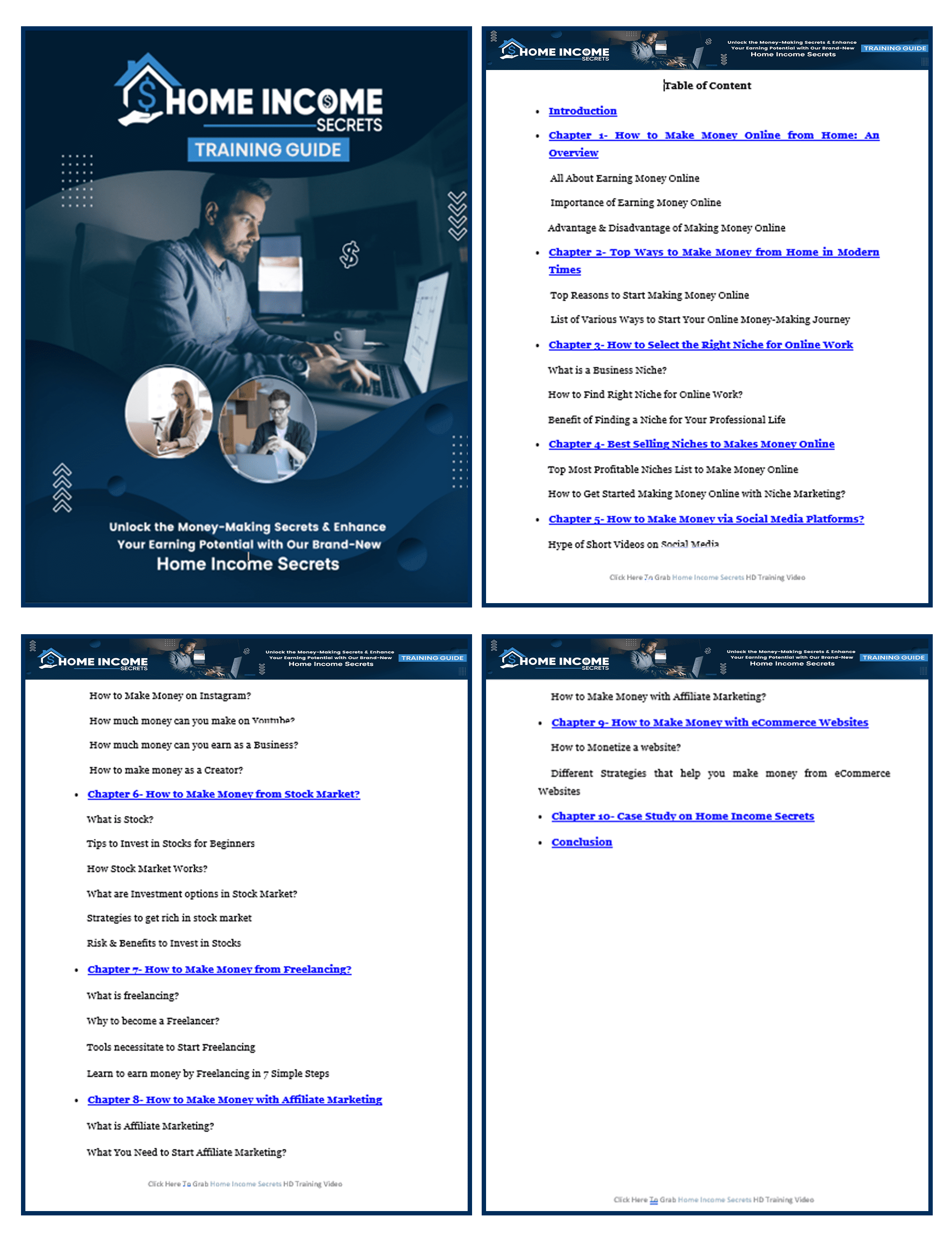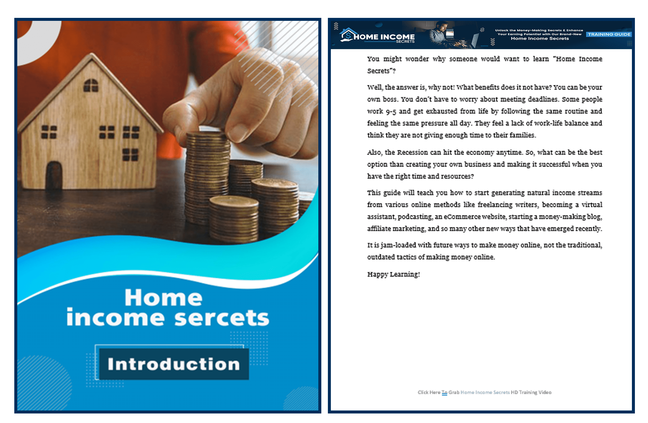 Our Awesome and Up-to-date " Home Income Secrets" course will help Your business to get a closer look at online money-making ideas and discuss tips to make your business successful from the comfort of your home.