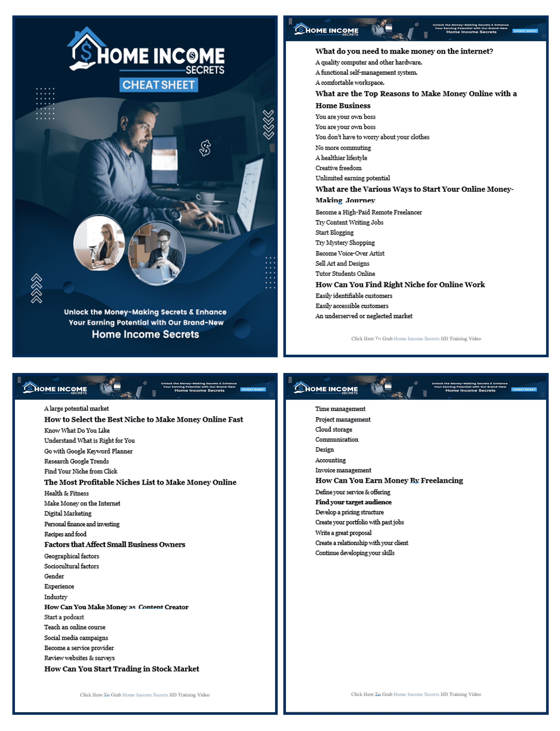 Our Awesome and Up-to-date " Home Income Secrets" course will help Your business to get a closer look at online money-making ideas and discuss tips to make your business successful from the comfort of your home.